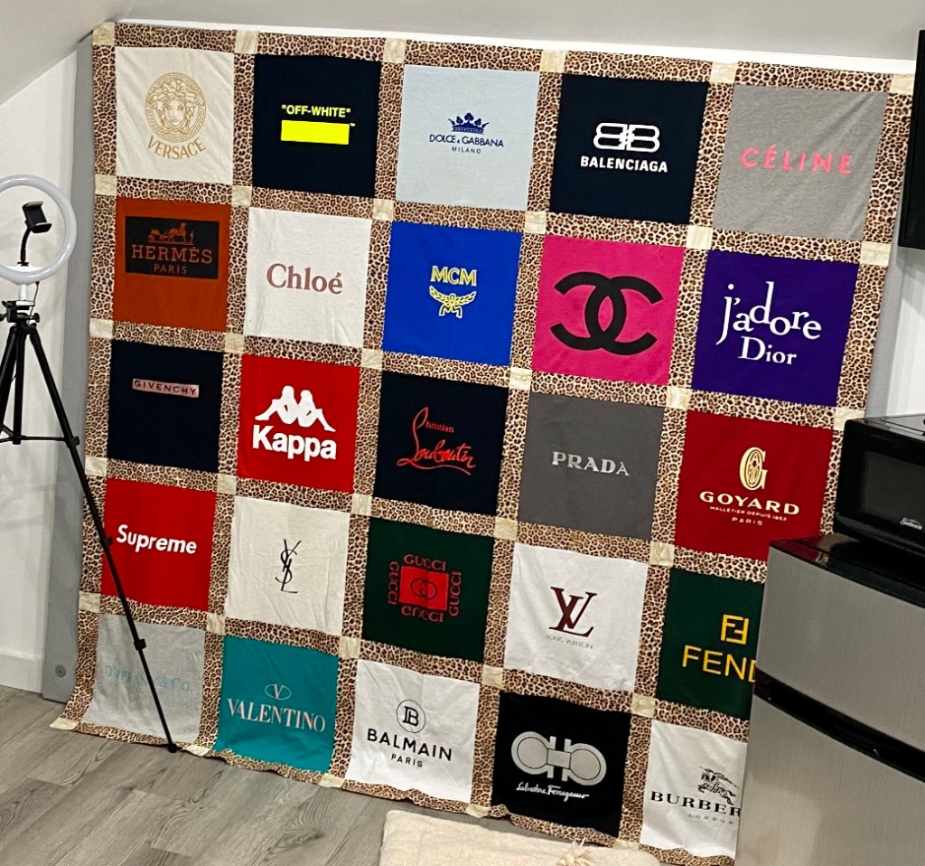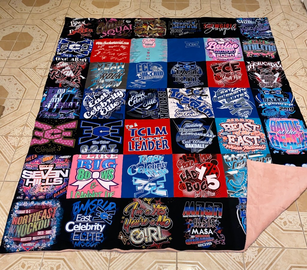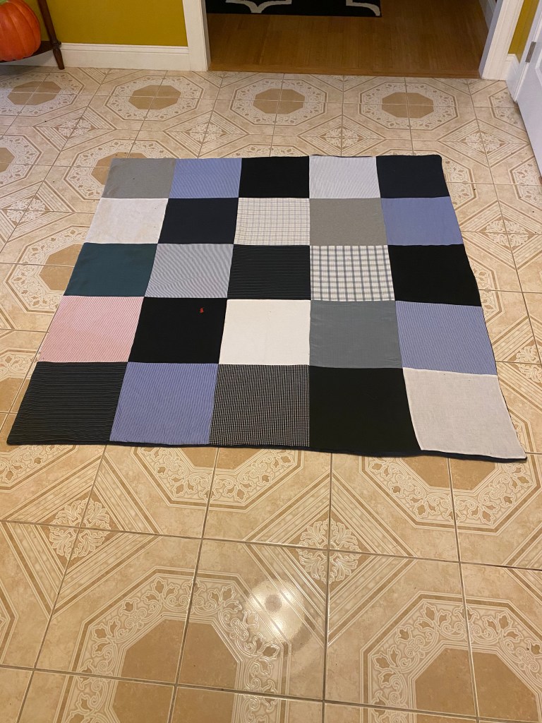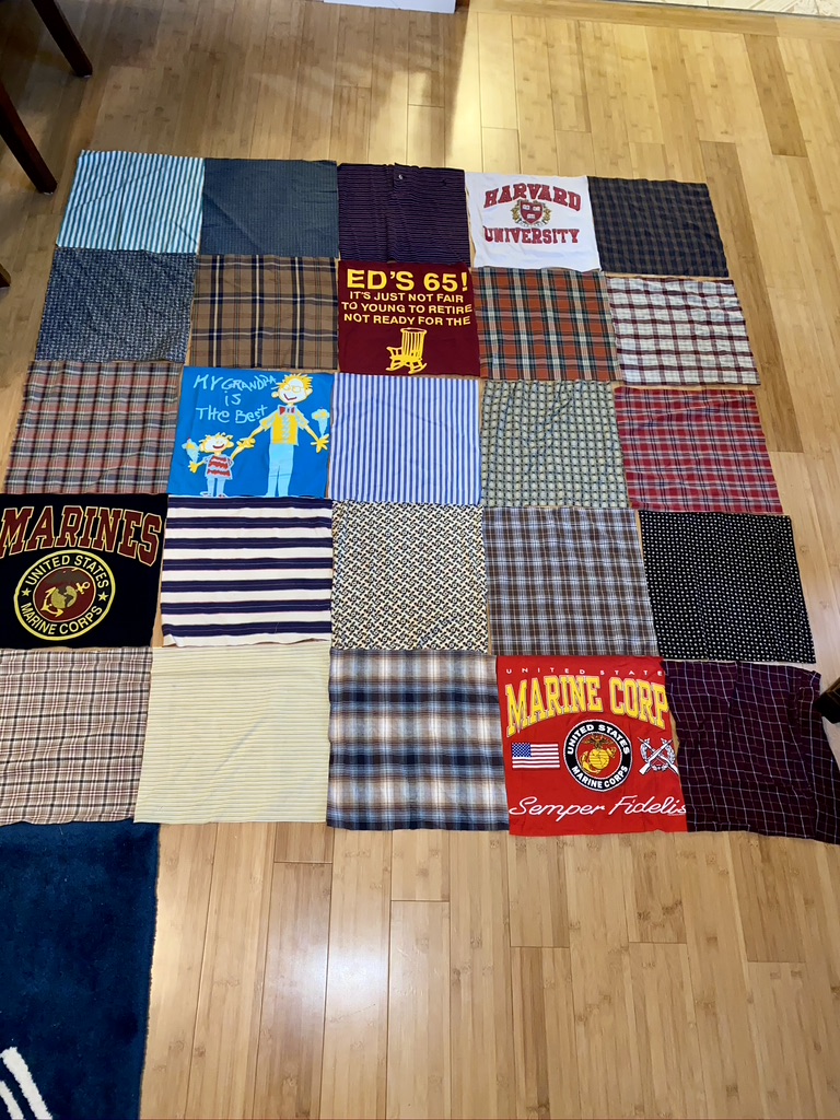 Every blanket comes with a custom designed layout sent directly to you . Any changes can be made at this point to the layout and designEvery quilt comes with a design layout sent to you before the blanket is constructed Every blanket has a custom layout included in the price any changes to the layout can be made at this point A whopping 56 panels!! Memory blanket with 4 custom embroidered panels, & multiple custom squares including a 70 year old wedding dress